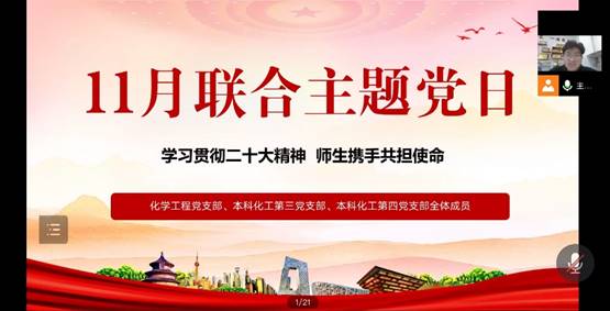 本网讯(通讯员 常琬笛)11月24日下午,mk网页版登录入口化学工程教师党支部、本科化工第三、第四党支部联合开展线上主题党日活动,师生党员共学共进,联学联建,在学校抗击疫情的特殊时期密切联系师生,凝聚党员力量。