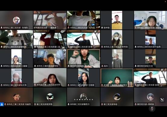 活动在庄严的国歌声中拉开帷幕,随后由本科化工第三党支部李帅辰同学领读入党誓词,全体与会师生于屏幕前右手高举过肩,齐声跟颂誓词。全体成员在奏唱国歌与重温入党誓词中感悟党的初心和使命。
