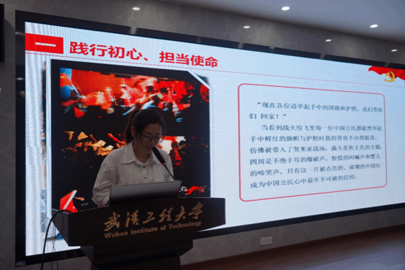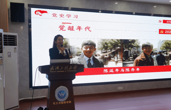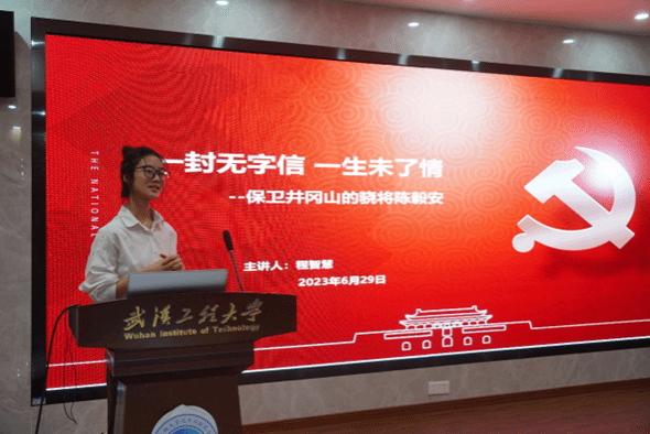 本科化工第一党支部的程智慧以“一封无字信,一生未了情”为题,向党员同学们分享了革命烈士陈毅安感人至深的故事;年少投身革命,与妻子54封家书句句饱含对国家对革命坚贞不渝的理想与憧憬,最后一封诀别书却是无字书;陈毅安的家书谱写了革命年代的一段浪漫史诗,更刻画了一位“生为人民生得伟大,死于革命死得光荣”的革命先烈的拳拳爱国之心。程智慧同学用陈毅安烈士的故事呼吁广大同学珍惜来之不易的学习生活,坚定不移听党话、跟党走,接过前辈手中的接力棒,让青春在火热实践中绽放绚丽之花!