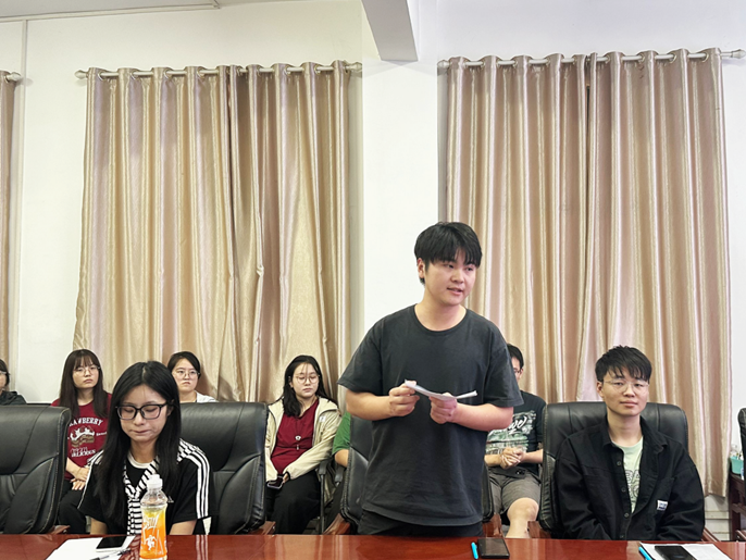2022级研究生会副主席,研材料化工党支部书记黄琦“围绕如何做好一名学生干部”发表经验分享。黄琦从自身学生干部经历出发,提出做好一名学生干部首先要做到提升自己的思想水平和执行能力——打铁还需自身硬。其次做好一名学生干部要学会具体问题具体分析,在工作中打开思维学会举一反三。最后号召各位学生干部充分发挥自己的能力做好老师和同学之间的桥梁与纽带作用。