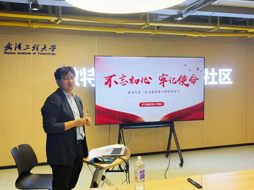 研究生第三党支部副书记李帅辰结合自身丰富的支部工作经验,对学生党务工作中的实践心得与创新做法进行了分享。