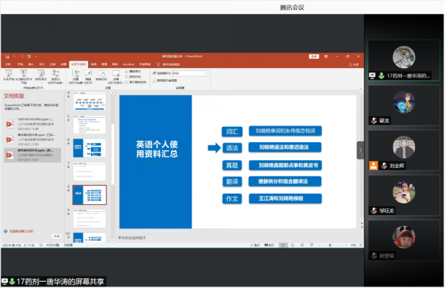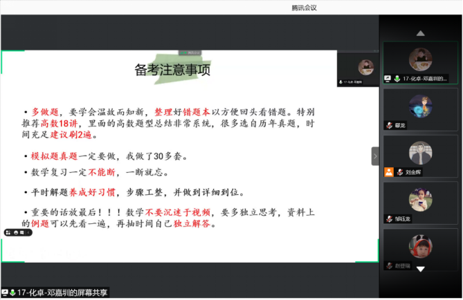 此次交流会通过腾讯会议开展,邀请了9位考取华南理工大学的学长学姐进行经验分享。交流会上,优秀考研代表们以自己的切身经历向同学们介绍自己的考研心得,从读研的必要性、备考的计划性进行了详细的讲解,分享了各科的复习方法、考研计划、信心的树立、心态的调整,以及有关选择专业方向和复试等方面的一些心得。