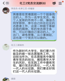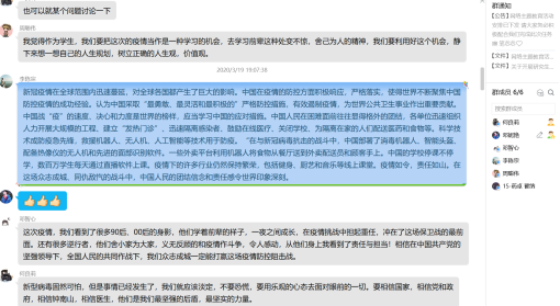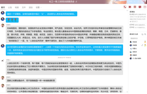 各支部党员在云端相聚,通过分享各自在疫情期间的“所见”“所闻”“所感”,生动展示了在中国共产党的领导下全国动员、全员参与抗疫的生动实践和奋斗精神。从武汉封城的壮士断腕之举、火神山雷神山的中国速度,联系到世界各国面对疫情时采取的不同措施;从人类命运共同体的大国担当、众志成城共克时艰的民族正能量,体会到中国特色社会主义制度的显著优势;从广大医务工作者的无畏逆行、志愿者们的无私奉献,领悟到打赢抗疫战争的关键在于激发人民群众的深厚伟力。一次次分享与讲述,强化了青年学子对中国特色社会主义道路的思想认同、情感认同、理论认同。
