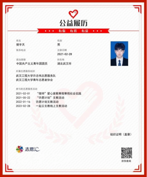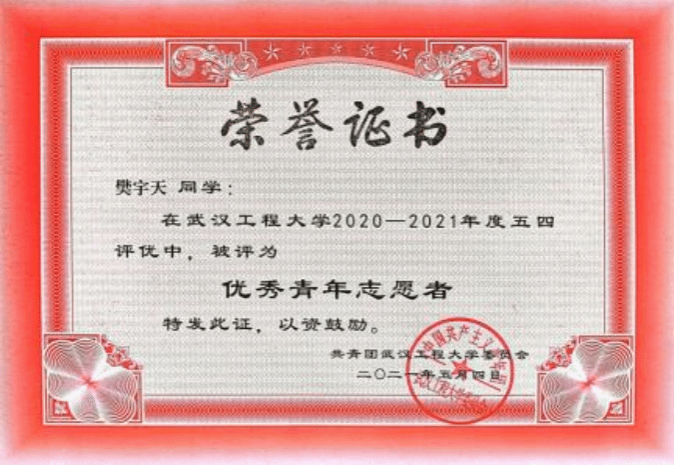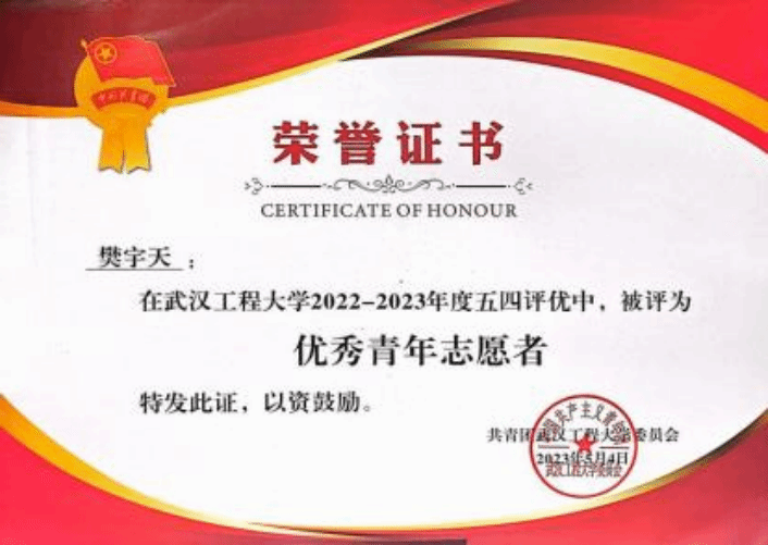 作为一名党员,樊宇天始终牢记全心全意为人民服务的宗旨,始终坚持将志愿服务精神转化为“融入日常、化作经常”的微小实践行动。他大学入学就加入了许志伟志愿服务队,参加了两期“许愿计划”支教活动、“微特”爱心家教活动、学校“一起云支教”活动,根据个人特长和专业优势,精心设置课堂内容,为小朋友教授趣味化学、英语口语、爱国教育等方面课程,用爱心和知识在孩子们心中播撒一颗梦想的种子。