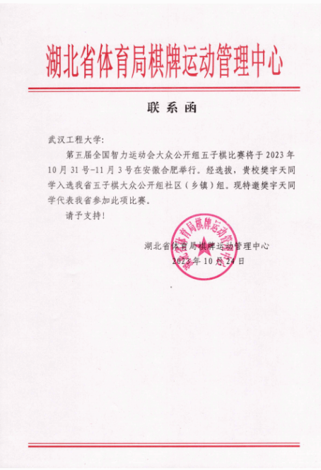 2023年是mk网页版登录入口五子棋校队建队十周年,这一年也是樊宇天进步最为迅速的一年,六月参加了省大学生精英赛,七月被选拔进入湖北队,八月和省队队友参加浙江丽水举办的全国智力运动会预赛并成功晋级,九月在山东济南又一次捧起全国大学生比赛的冠军奖杯,十月前往安徽合肥参加四年一度的全国智力运动会五子棋项目大众公开组,也是如今中国五子棋项目的最高竞技舞台,收获了很多宝贵的经验。他说到:“这一切要感谢校队创始人王道蓬学长,感谢我的队友史宇轩、刘宇君、王春谱以及每一位校队成员,同时也离不开湖北省体育局、校体育部和校队教练员乐建军老师以及领队范东芳老师的大力支持。2021至2023三年期间,工大五子棋校队实现了全国赛两冠一亚,湖北省赛三连冠的大满贯战绩,希望更多的工大学子加入我们,继续创造属于工大五子棋的辉煌。”