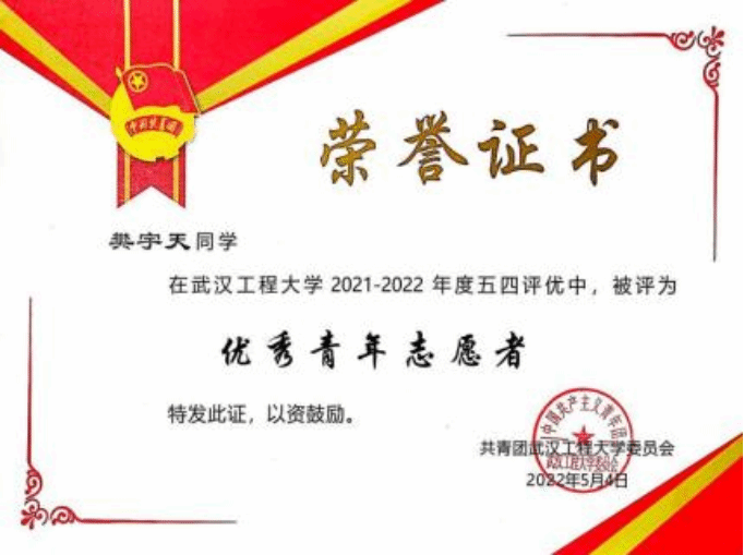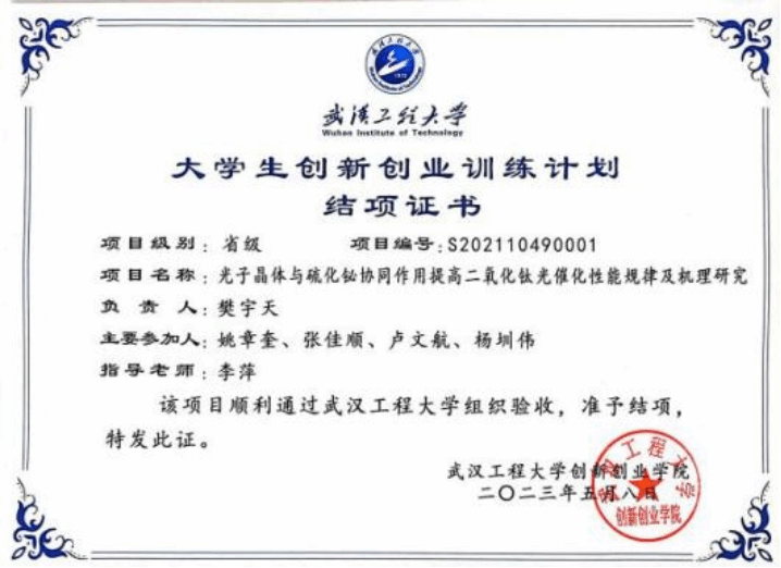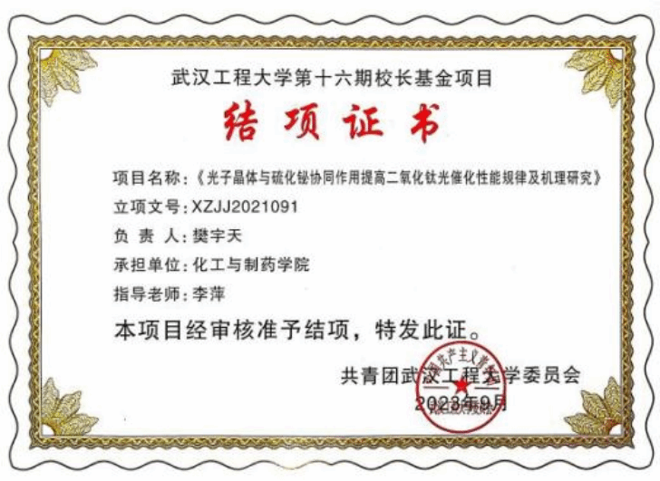 从大一开始,樊宇天申请加入学院李萍老师的实验室进行科研训练,主持了湖北省大学生创新创业项目1项和mk网页版登录入口校长基金项目1项,目前均已结项;发表论文5篇,其中一区SCI期刊论文1篇、二区SCI期刊论文1篇。