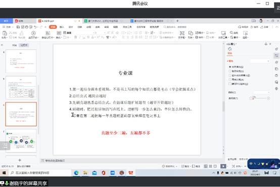 柳炎志、王诗怡、黄睿、谢晓宇、吴欣蔚依次在分享中重点讲解了考研英语、政治、数学及专业课的复习方法与备考策略,建议同学们要提前制定备考计划,注重学科基础知识,及时归纳总结。在交流提问环节,同学们积极踊跃发言,就专业及学校情况、时间安排及复习资料等内容进行提问,学长学姐们进行详尽的解答。