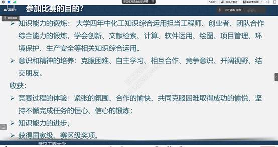 杨犁讲解全国大学生化工设计竞赛对化工与制药类专业学生的重要意义,能够多方面培养大学生的创新思维和工程技能,培养团队协作精神,增强大学生的工程设计能力与实践能力,建议同学们参考已有的化学工艺流程进行设计思路创新,不断完善参赛作品。张林锋就组织报名、队员分工、时间分配及作品提交等事项进行重点说明。