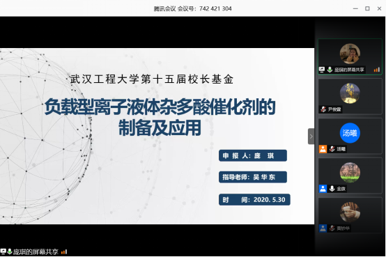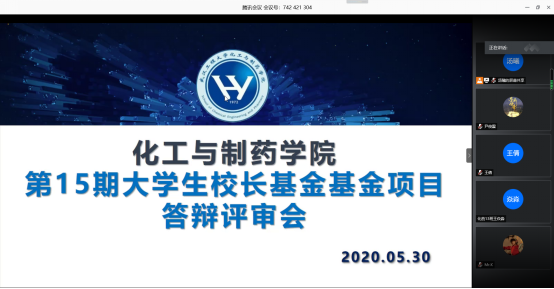 本网讯(通讯员 汤曦)5月30日下午,mk网页版登录入口通过腾讯会议举行第十五期校长基金立项答辩云端评审会。副院长龙思会教授、金放教授,院长助理闫志国教授、制药工程中心主任古双喜教授和化工系副主任熊芸副教授担任评审专家并出席会议,会议由院团委书记黄钞华主持,项目组成员及部分18、19级学生参加会议。