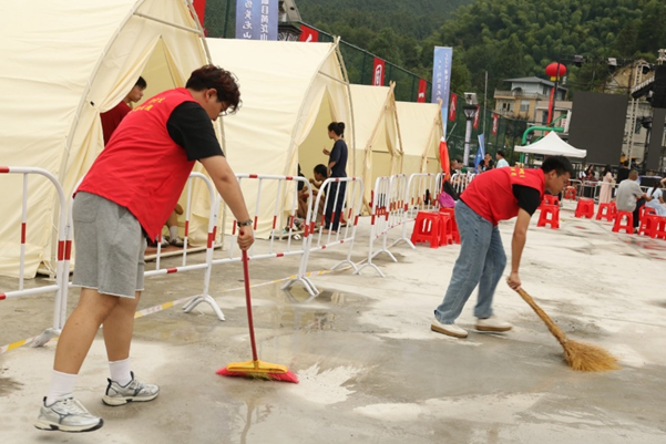 志愿服务正式开始之后,大家自觉听从领队安排,以小组为单位进行服务,活动期间,用实际行动,以积极的工作态度和饱满的工作热情充分地弘扬了“奉献、友爱、互助、进步”的志愿服务精神,协助主办方做好地面清扫、垃圾捡拾、嘉宾席桌椅整理和秩序维护等服务,为参与活动的游客们提供更加完美的露营体验。