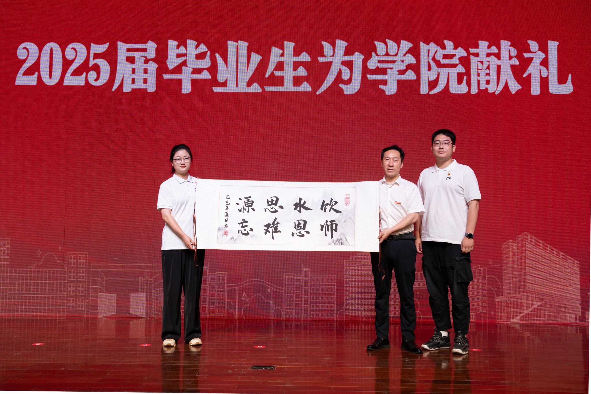 毕业生代表向学院敬赠精心准备的毕业纪念品,表达对学院的感恩之情,院党委书记杨海波代表学院郑重接受了这份心意。“饮水思源,师恩难忘”,一笔一划勾勒出毕业学子对学院的深情。