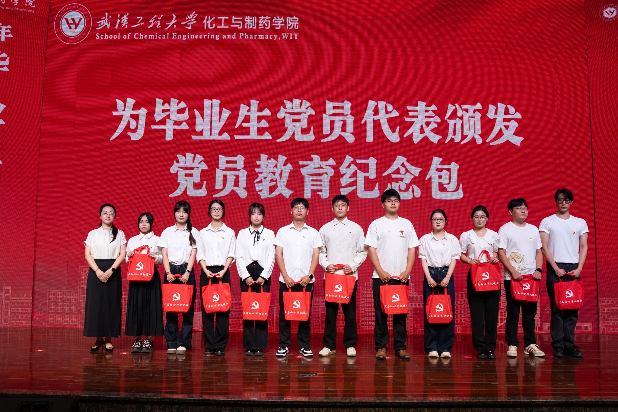 周丹为毕业生党员代表颁发党员教育纪念包,鼓励毕业生党员牢记党员身份,永葆先进本色。
