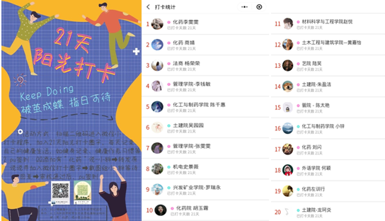 学院还发起21天阳光打卡,Keep doing活动,依托“小打卡”微信小程序,共有1112名同学参与活动,打卡总数达1424条,连续三天获市级热门活动第一名,连续12天位列市级热门活动前十!经过21天的历练,共有20名小伙伴完成21天全勤打卡! “21天阳光打卡活动”鼓励同学们居家也能有一个健康阳光的生活习惯。