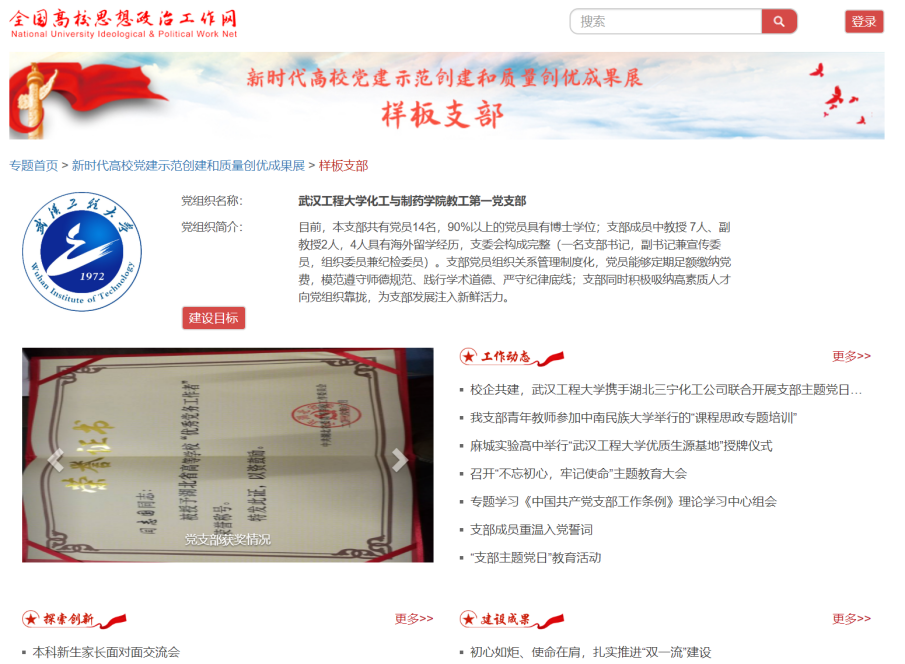 亮承诺、创优工作业绩。支部全员参与化学工程与工艺专业认证工作、化学工程与工艺“国家一流本科专业”及化学工程与工艺专业省级教学团队申报(均已获批),设计并修订化学工程与工艺专业2020版课程教学大纲;全面实施《青年教师工程能力与教学能力提升计划》,由教学经验丰富的老教师“传帮带”,对新任职三年内的14名青年教师分别选派一名具有工程能力、教学效果好的资深教师进行结对培养、辅导。支部党员教师潜心教学,高家俊老师荣获2018年校青年教师教学基本功竞赛一等奖、校“十大优秀青年教师”,化工专业建设与改革教学团队荣获“全国石油和化工教育优秀教学团队”。殷霞、吴再坤等老师获批2018校级重点教研项目,金放、闫志国等老师发表多篇教学研究论文。支部罗晓刚、周芳老师获批国家自然科学基金面上项目,高家俊、李昱达等老师获批国家青年基金项目;吴广文、程健、殷霞老师分别获得湖北省科技进步奖三等奖,支部老师平均每年发表研究论文30多篇,其中被SCI收录20多篇。