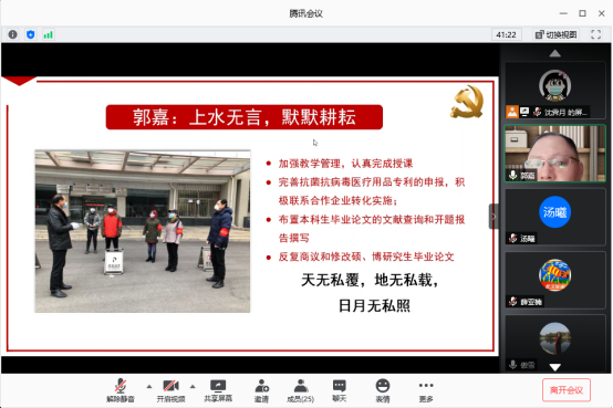 学院抗疫志愿者代表郭嘉、龙秉文、李雁博分别以“上水无言,默默耕耘”“抗疫有我,让党旗高高飘扬”“我是党员,我在家门口防控疫情”为主题,向党员教师分享了自己疫情期间为工大社区捐献物资、分发蔬菜、协助管控的故事。科研二支部书记龙秉文表示,作为党员,必须在关键时刻挺身而出,起表率作用,在疫情面前,不畏艰难,贡献自己的一份力量。虽然疫情已经得到了基本控制,但是依然不能放松要求,坚持教学、防疫两手抓,将学院疫情防控工作不折不扣地落到实处。