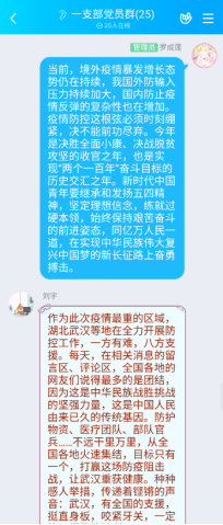 活动过程中,支部党员们围绕学习习近平总书记五四寄语精神,深入理解习近平总书记五四寄语的准确内涵,学生党员们围绕青年学子使命与担当、疫情防控期间的学习与成长等话题展开热烈讨论,交流学习心得。本科第二支部党员鲁思汝表示,作为新时代青年,就要甘于奉献,到祖国最需要的地方,到人民最需要的地方,奉献青春,挥洒汗水,在祖国的广阔腹地和人民的坚实土壤中茁壮成长。