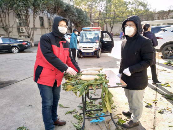 第一次值班,龙老师和李老师的主要任务是为社区的居民分发蔬菜。从上午八点半到下午五点,他们要从仓库将新鲜的蔬菜搬运到社区门口,按分量分好份儿,然后将蔬菜分发给有需要的居民,确保社区的居民在疫情期间的生活不受影响。短短的路程,来回搬运下来,早已汗流浃背,为了防护需要,他们再闷也不能脱掉口罩。分发蔬菜期间,党员教师们时刻提醒前来取菜的居民,要做好防护措施,疏导他们的情绪,倡导大家理性对待疫情、增强抗疫信心、做好健康自查。