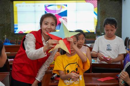 在盐池县花马池镇花园社区“筑梦课堂”上,“许愿计划”实践团成员们当起了线下小老师,为孩子们带去了“榜样人物黄文秀”“英语游戏小课堂”、手工剪纸课等丰富多彩的线下课程。