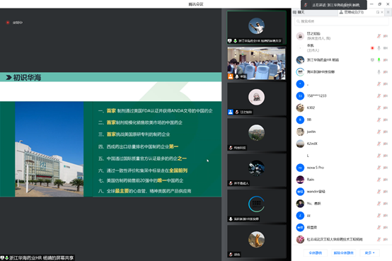 本次线上宣讲会利用腾讯会议平台,共邀请了化工生产、药物合成、工程设计等不同类型的九家企业开展宣讲,岗位需求达300余人,涵盖了化学工程、制药工程、药物制剂、材料化学等多个专业,切实满足了学院本科生、研究生的就业岗位需求。