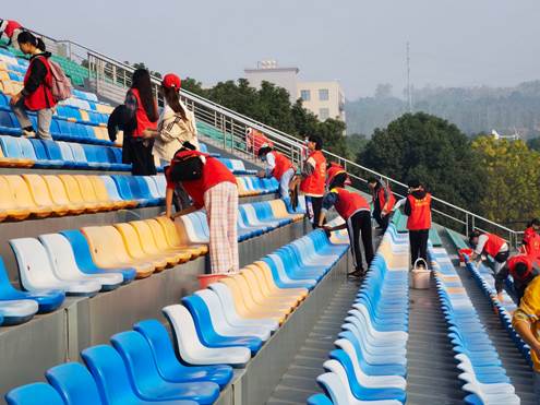 校运动会前,许志伟志愿服务队联合“爱在天涯”公益志愿社、“机电红齿轮”志愿服务队、光能数理学院志愿者协会和校志愿者协会一同对操场全部座椅进行清扫,以全新的整洁姿态迎接运动会。学院团委学生会每一位成员从运动会伊始,就活跃在工大的每一个角落。训练陪同、物资供应、医疗防护、如影随形,感谢在背后默默奉献的同学们!