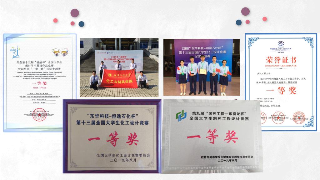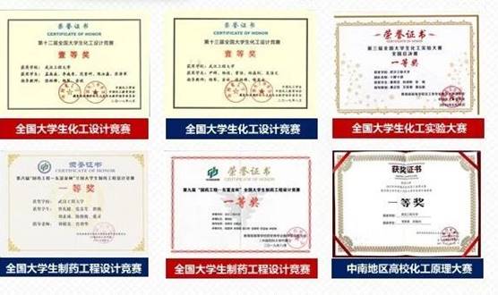 学院学生团队连续三年蝉联全国大学生化工设计竞赛全国一等奖,“国药工程-东富龙杯”全国大学生制药工程设计竞赛全国一等奖。在全国大学生化工实验大赛全国竞赛中连续三年取得好成绩,分别荣获全国总决赛国家一等奖,中南赛区特等奖,中南赛区竞赛省级二等奖。学院学生在“互联网+化学反应工程”课模设计大赛、大学生创业大赛创业计划竞赛、全国大学生药苑论坛等各类竞赛中共获奖30余项。