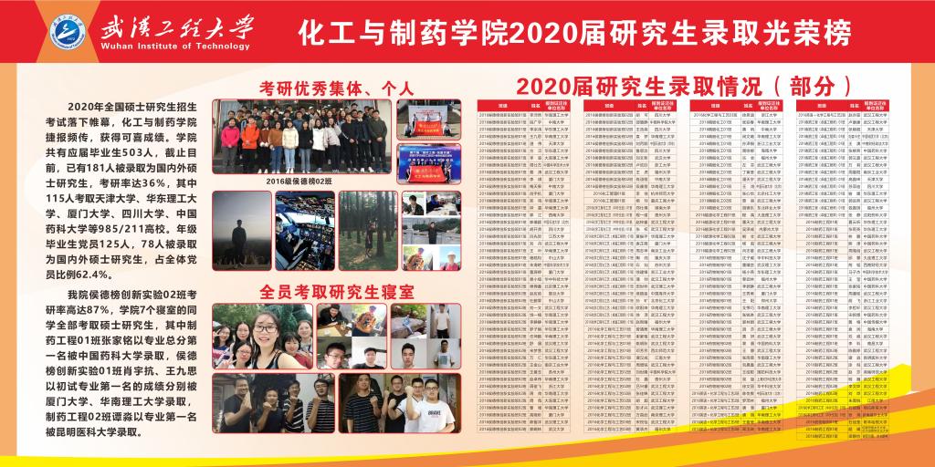 2020届毕业生考研中有181人被录取为国内外硕士研究生,其中115人被天津大学、华东理工大学、华南理工大学、厦门大学、浙江大学、复旦大学、中科院大学、四川大学、中国药科大学等双一流高校录取,其中侯德榜创新实验2班考研率达87%,学院7个寝室的全部同学全部考取硕士研究生,5人赴新南威尔士大学、格拉斯哥大学、哥本哈根大学等国际知名大学进行深造。化工与制药类专业社会需求良好,毕业生就业形势较好,前景广阔,其中有大量学生被中石油、中石化、中海油、强生、国药集团、中国水利水电等世界500强企业录用。