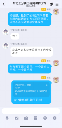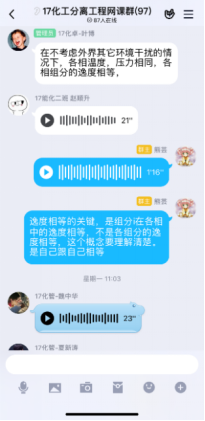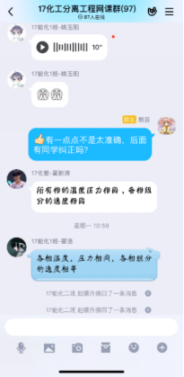 第一次在线课程快结束时,有学生反馈,虽然互动的形式很有意思,但效率不高,因为优学院app的聊天功能受限,不能发语音;每门课程的班级都有一个群聊,且群聊名称都一样,并不知道分离工程的课程群聊是哪个。在接纳了同学们的意见后,决定网上教学不完全依赖优学院平台,发起投票,由学生决定互动环节在QQ群内进行还是在钉钉上进行,多数学生选择了QQ平台,于是建立了QQ网课群,采用优学院+QQ群双管齐下的模式,开展网络教学。