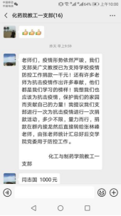 与此同时,学院教工三支部党员古双喜等教师也积极行动起来,伸出援助之手,加入抗疫爱心捐赠队伍。党员教师们纷纷表示,钱虽然不多,但代表了同志们为疫情防控工作贡献一份力量;目前要先做好自身防护、不信谣不传谣,为身边亲友做出良好示范,为控制疫情做出实实在在的贡献。
