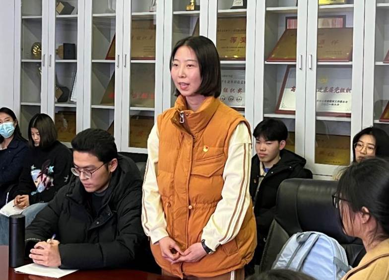 会上,本科第二支部陈恒君,讲述了家乡几十年如一日地坚持学习、宣讲党史的 “党史爷爷”王明林的故事。党的二十大胜利召开后,党史爷爷王明林又开设了“喜迎二十大永远跟党走”云端大讲堂,用实际行动践行着 “不给后人留堆金,要为后人留本经”的座右铭;陈恒君同学用王明林老人平凡而伟大的事迹鼓励所有学生党员,作为新时代的大学生,我们要认真学习贯彻党的二十大精神,一定牢记习近平总书记嘱托,坚定理想信念,筑牢精神之基,厚植爱国情怀,涵养进取品格,矢志不渝跟党走。