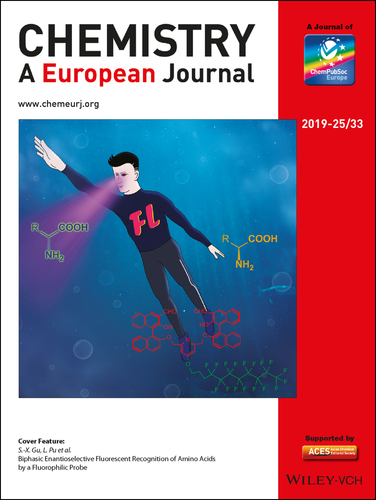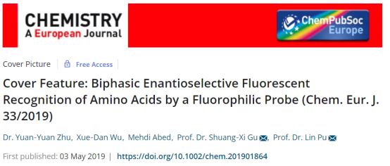 此研究成果前期以“Biphasic Enantioselective Fluorescent Recognition of Amino Acids by a Fluorophilic Probe”为标题、以full paper的形式发表在化学领域权威期刊《欧洲化学》(Chemistry-A European Journal)上()。该论文入选《欧洲化学》热点论文(hot paper),并被《欧洲化学》作为封面特色文章(cover feature)进行了介绍()。论文的共同通讯作者为mk网页版登录入口特聘教授古双喜博士和弗吉尼亚大学大学化学系Lin Pu教授;第一作者为团队成员、化学与环境工程学院朱园园博士。mk网页版登录入口为论文的通讯单位和第一单位。
