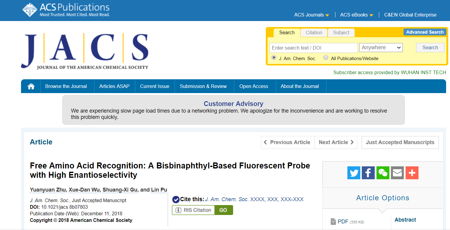 本网讯(通讯员周丹)近日,我校mk网页版登录入口古双喜博士、化学与环境工程学院朱园园博士分别以通讯作者和第一作者身份与美国弗吉尼亚大学Lin Pu教授(通讯作者)合作在化学领域顶尖期刊Journal of the American Chemical Society(简称JACS)上发表标题为“Free Amino Acid Recognition:A Bisbinaphthyl-Based Fluorescent Probe with High Enantioselectivity”的高水平研究论文。(论文链接:)