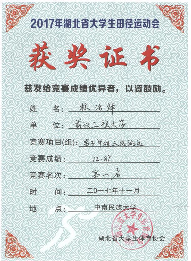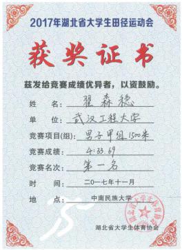 湖北省大学生田径运动会是我省大学生单项体育赛事中规模最大、参赛人数最多的赛事,此次运动会由湖北省教育厅和湖北省体育局主办,中南民族大学承办,来自省内78所高校的1086名运动员参加比赛。经过激烈角逐,mk网页版登录入口2016级药物制剂01班翟森稳同学以4分33秒69的成绩获得男子甲组1500米第一名;2017级化工与制药类07班林浩峰同学以12米87的成绩获得男子甲组三级跳远第一名。