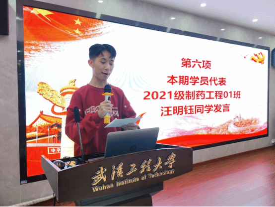 第14期学员代表2021级制药工程01班汪明钰同学向关心他们成长和发展的老师们致以崇高敬意和衷心感谢,并讲述了他从产生入党意愿到如今立志为实现中国梦而奋斗的心路历程,他呼吁全体发展对象以党的二十大精神作为指引,攻坚克难,以舍我其谁的昂扬斗志,在新时代蓝图中书写传奇。