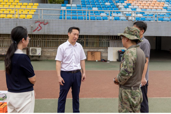 杨海波、周丹来到训练场,与教官深入交流,细致了解军训工作的各个环节。杨海波对教官们不畏辛苦、严格施训,全身心地投入到新生军训工作表示衷心的感谢。他指出,军训是新生的第一课,是大学生接受国防教育的重要载体,通过军训可以塑造大学生灵魂,培养学生的团队意识和坚强的意志品质,希望教官们在军训工作中加强组织管理,对学生严格要求,科学施训、张弛有度,预祝军训取得圆满成功!