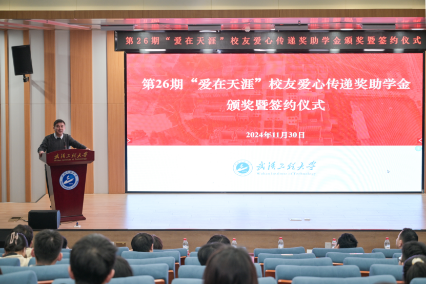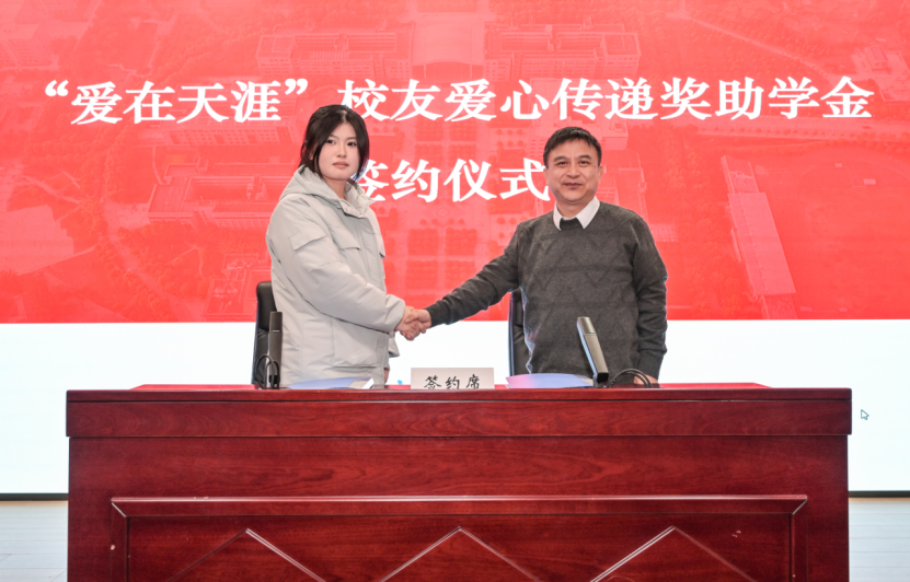 仪式上,李志旭代表校党委、校行政对“爱在天涯”奖助学金设奖校友的一直以来为学校建设与人才培养做出的贡献表示衷心感谢,向此次获得奖助学金的学生表示祝贺。他表示,学校各项事业的发展进步离不开广大校友的倾情相助和鼎力支持,希望各位校友能常回家看看,一如既往地支持和关心学校发展,用校友智慧和校友力量共助学校谱写事业高质量发展的新篇章。他向获奖学生提出殷切期望:一是要坚定理想信念,树立报国之志,以习近平新时代中国特色社会主义思想立根铸魂、强基固本,厚植家国情怀,汲取精神伟力,用实际行动践行“请党放心,强国有我”的青春誓言。二是要常怀感恩之心,常举谢恩之行,将感恩之情牢记于心,将大爱之心薪火相传,让青春在奋斗与奉献中绽放绚丽光彩,以更加优秀的表现回报社会、回馈母校,不负校友们的厚望。三是要坚持自强不息,锤炼过硬本领,在所学专业领域深入钻研,以“勤为径”向“上”攀登,以“心作谷”向“下”扎根,聚焦内涵式发展,在勤学中扎实学识,在实践中锤炼本领,奋力书写挺膺担当的青春篇章。
