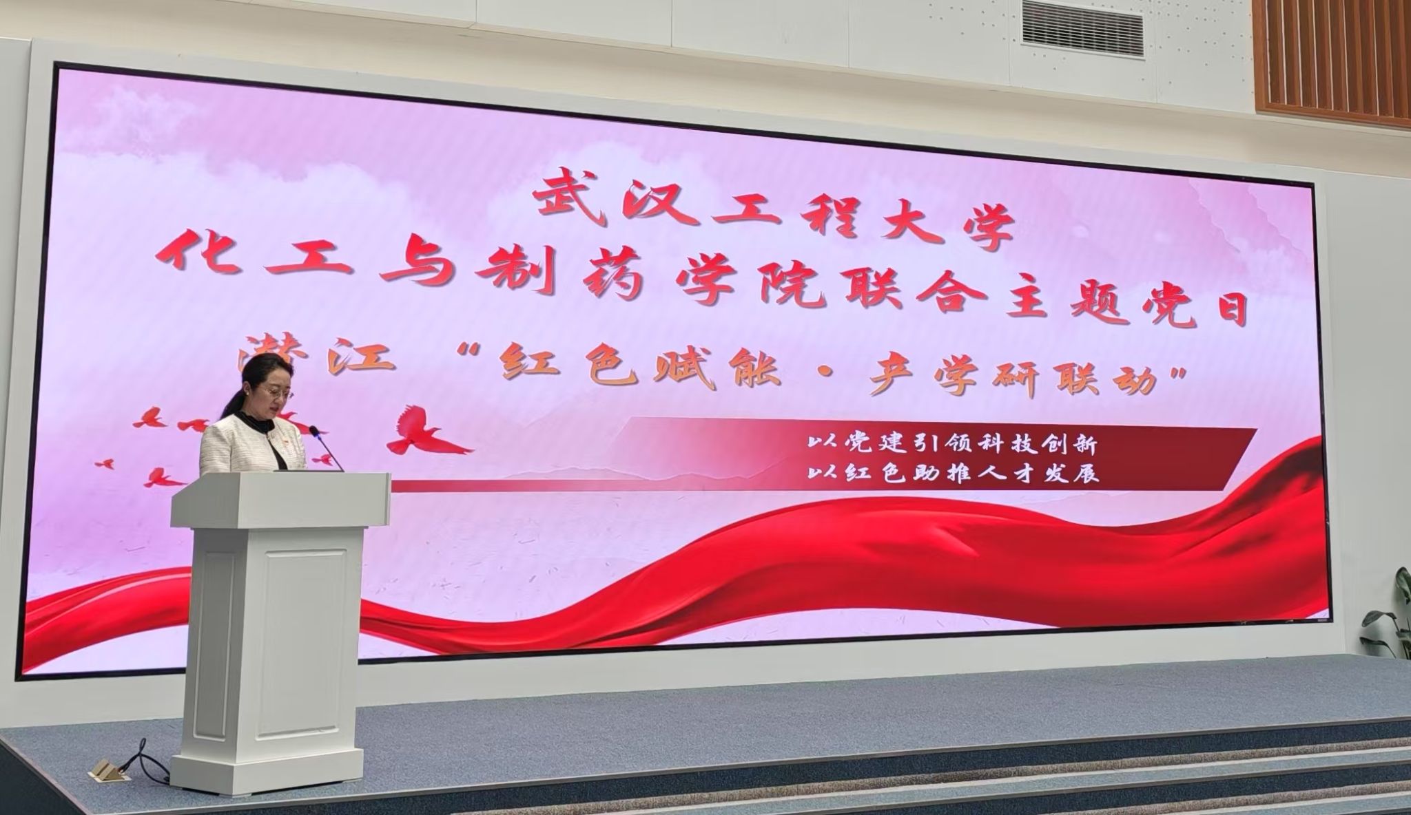周丹向学生党员提出四点要求:一是以“红色基因”筑牢信仰之基。要传承革命先辈“敢教日月换新天”的革命精神,坚定“听党话、跟党走”的信念,将个人理想融入“化工强国”“健康中国”的伟大事业中;二是以“前沿视野”引领创新之行。要胸怀国之大者,紧盯智能制造、绿色合成、智能制药、低碳化工等全球前沿方向,在学科交叉中寻找突破点,不断成长为“懂技术、会创新”的复合型人才;三是以“工匠精神”锤炼实干之能。要学习潜江企业“精益求精”“十年磨一剑”的坚守与精神,在实验台前追求极致,在实习实训中打磨技能,带着“真问题”做科研,将“实验室数据”转化为“生产线生产力”。四是以“协同思维”践行报国之志。深刻体会潜江“产学研用”一体化的成功经验,主动参与学院与企业的联合课题,既懂实验室“小循环”,更懂产业“大生态”,成为联通科技创新与产业升级的纽带。