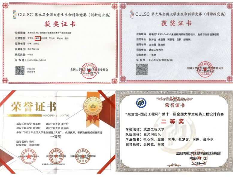 班级同学积极参与各类学科竞赛,取得了优异的成绩,共获国家级奖项18人次,省部级奖项12人次,校级奖项80余人次。在竞赛过程中,同学们充分发挥团队协作精神,集思广益,共同攻克难题。同学们在国内权威学科竞赛中,斩获诸多荣誉。张心怡、金蕾、张梦含3名同学荣获“全国大学生生命科学竞赛国家一等奖”;在专业权威比赛“全国大学生制药工程设计竞赛”中,张心怡、金蕾、何振等5名同学荣获国家二等奖,胡郡、宁彩红同学荣获国家三等奖;“全国大学生化工设计竞赛”中何振、冯克任同学荣获国家二等奖,王妍、郑子珊等4名同学获荣获国家三等奖;张心怡名同学荣获“中美青年创客大赛”全国三等奖;在第八届“互联网+”大学生创新创业大赛中,张心怡同学荣获全国铜奖;在“挑战杯·中国银行”大学生课外学术科技作品竞赛中张心怡同学荣获湖北省金奖,金蕾同学获得湖北省银奖;陈辉洋同学获2022年第十四届数学竞赛(非数学专业)国家级三等奖;同时班级同学积极参与校园文化活动,如象棋比赛、辩论赛等,程依凡同学在2022年湖北省象棋锦标赛中荣获团体第五。