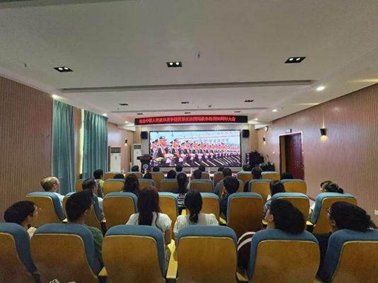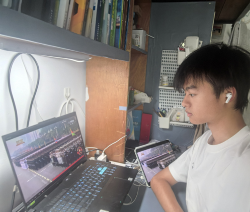 会议现场秩序井然,全体师生精神饱满、全神贯注。随着空中护旗梯队划破长空,阅兵式正式拉开帷幕。45个方(梯)队依次通过天安门广场,徒步方队步伐铿锵,装备方队铁流滚滚,空中梯队战鹰呼啸,充分展现了中国军队现代化建设的辉煌成就,让每一位师生都倍感自豪。