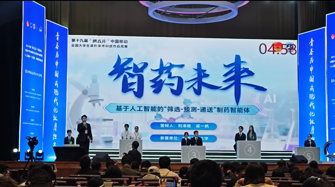 在“挑战杯”“人工智能+”专项赛·挑战赛赛道中,由刘捷、刘根炎、喻发全老师指导,学生梁一帆、刘泽楷、王梓恒、方涵、刘程、吴易雯、张诗月、李紫鹃、李诗健、杨佳赛参与的“基于人工智能的药物高效筛选、预测和递送智能体的构建”项目,荣获全国特等奖。该项目围绕制药行业智能化升级需求,将人工智能算法与传统制药工艺深度融合,有效解决了行业内长期存在的难题,项目技术创新性和实际应用价值获得评委一致认可。