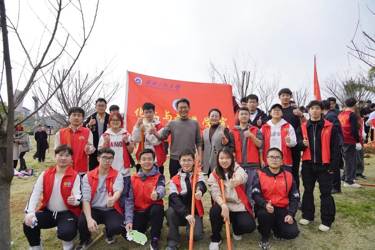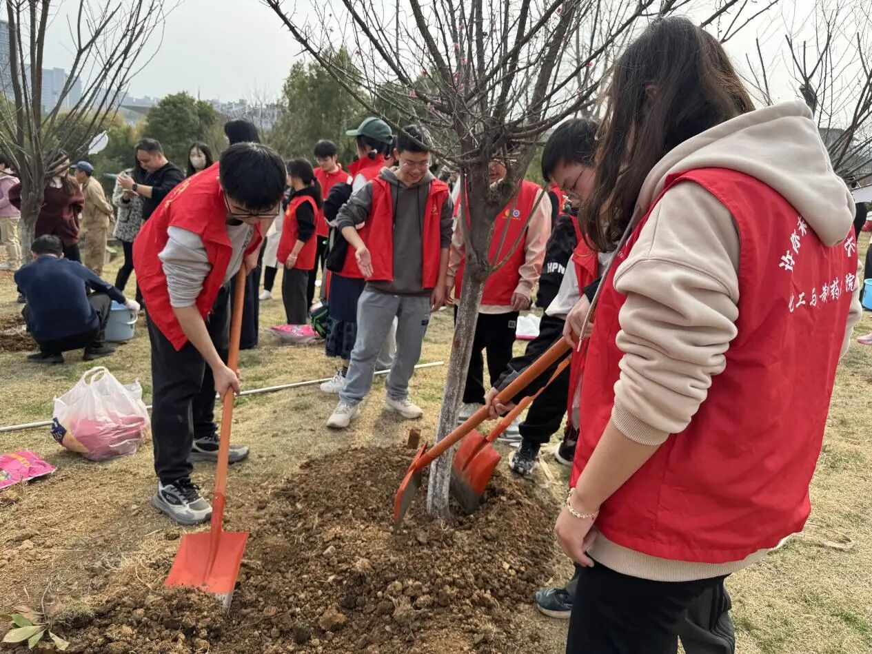 活动现场,教师与学生搭档成组,挥汗挖坑培土;女生们细心扶正树苗,男生接力浇灌清水,枝桠间悬挂的“化药专属祝福树牌”随风轻摆,浸润着师生共建生态校园的热望。这场春日里的集体劳作,化药师生以最朴实的躬身之姿,将协作与担当精神深深镌刻进泥土芬芳中。