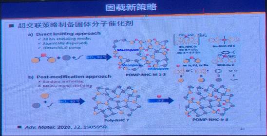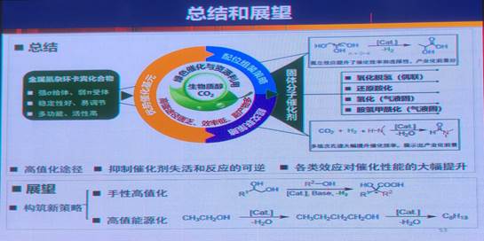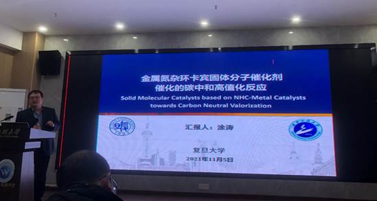 涂教授首先从当前面临的环境问题出发,介绍了“碳中和”、“碳达标”等国家重大战略和实现这一目标的可能途径。接下来,涂教授结合团队的研究方向与兴趣,向大家介绍了金属氮杂环卡宾固体分子催化剂的设计思路、表征、及其在乳酸制备、山梨醇糖的高值化利用、固碳(CO2)等方面取得的进展和下一步的研究思路。