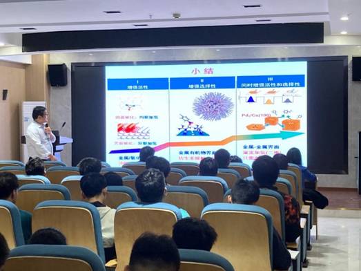本次报告从催化加氢在化工生产中的应用开始,指出多相催化过程中多参数共同影响反应性能,且参数间相互纠缠,随后傅钢教授向我们介绍了表界面催化剂调控对催化加氢反应的影响。报告分别介绍了单原子(团簇)催化、金属/氧化物界面催化、单原子合金和金属有机界面这四个方面。首先,以Ru1/γ-Al2O3、Pd2CO/TiO2催化剂为例,介绍单原子-团簇-纳米颗粒催化剂加氢性能与理论计算如何进行匹配;第二,以常见高活性Cu/SiO2催化剂为例,介绍如何在研究中研究纳米效应和界面效应,并指出构建最大化Cu-OH-SiOx界面对草酸二甲酯加氢性能提高的策略;第三,傅钢团队深入研究二维活性氧化物界面,以常见PdCu合金催化剂为例,介绍如何突破默认理论认知,以及理论是如何指导实验进行快速的验证。已知的合金效应无法解释PdCu催化剂在苯乙炔加氢中的性能,傅钢教授提出以Cu2O/Pd/Cu半透视界面进行加氢新机制;最后介绍了配体诱导界面电子效应是如何提升加氢选择性的构效关联。整场报告内容丰富、引人入胜,具备层次性、贯通性,深入浅出,带领与会师生一起对表界面催化加氢理论有了更深的认识。